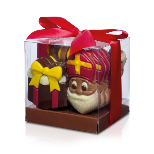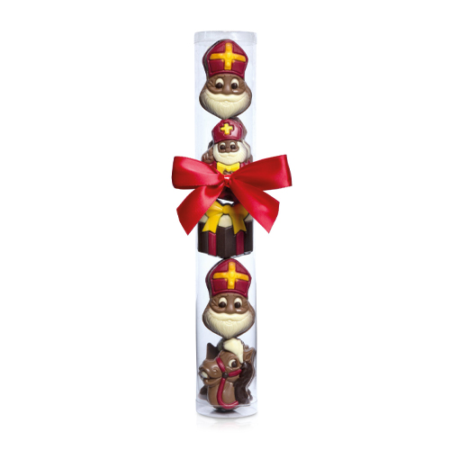 Transparante koker gevuld met 320 gram gemende sint chocolade.